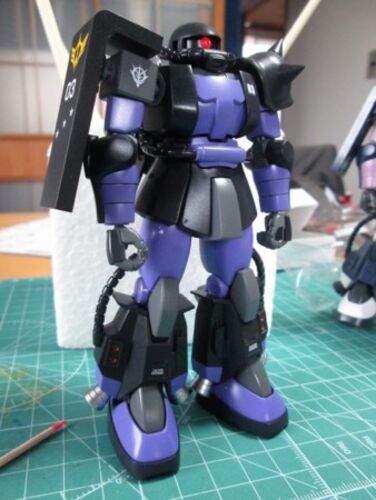 ●正確にはザク?の黒い三連星仕様らしいですが。HGUCの1/144。 ドムと同じなら白はないだろう、と黒、グレイ、紫で吹いてみたわけですが。白があった方がよかったかも。 ザク?のバックパックの上の丸い部分(燃料タンク?)をパーソナルカラーにするのが好き…